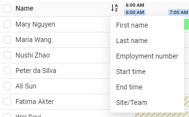 To sort the schedule by agent name, employment number, end time, or team, click the sort icon at the top left of the page.