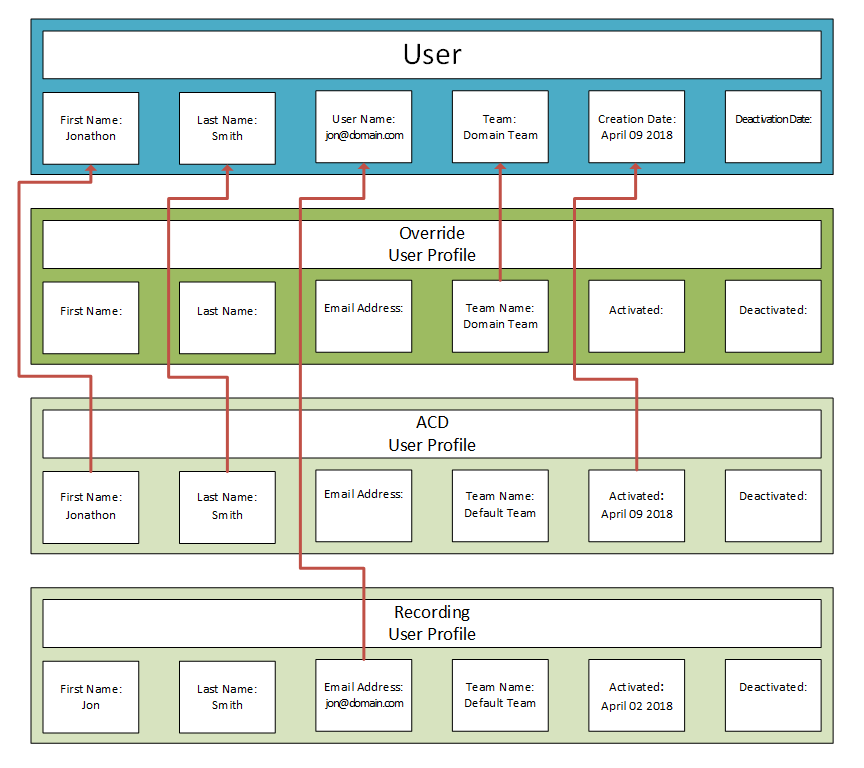 The following image shows how a Calabrio for RingCX user’s identity is created from the values contained in three user profiles. The user profiles are ranked according to their precedence, as they are in the User Profiles table: from highest (Override) to lowest (Recording). To create the Calabrio for RingCX user’s identity, Calabrio for RingCX selects the first non-blank value for each field from the profile with the highest precedence.
