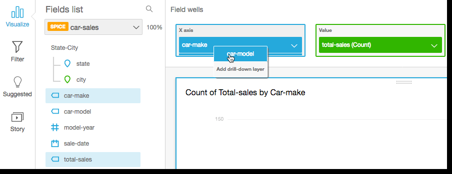 The field wells you can use to create drill-downs varies by visual type. Refer to the topic on each visual type to learn more about its drill-down support.