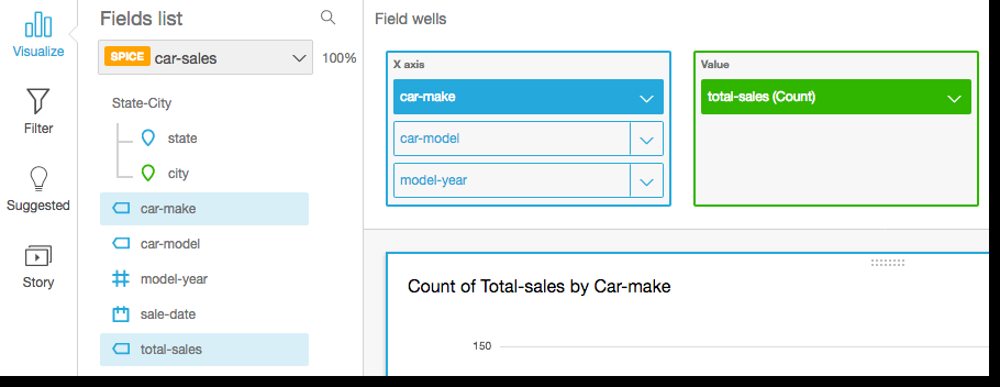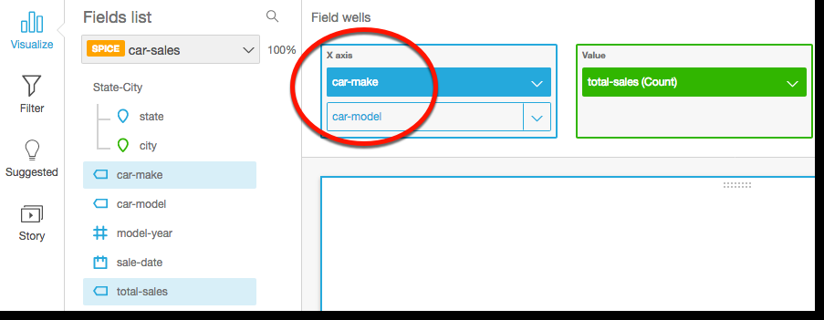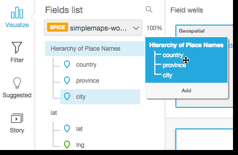 If your dataset has a defined hierarchy, you can drag the entire hierarchy into the field well as one. For example, geospatial or coordinate data. In this case, you do not need to follow the remaining steps.