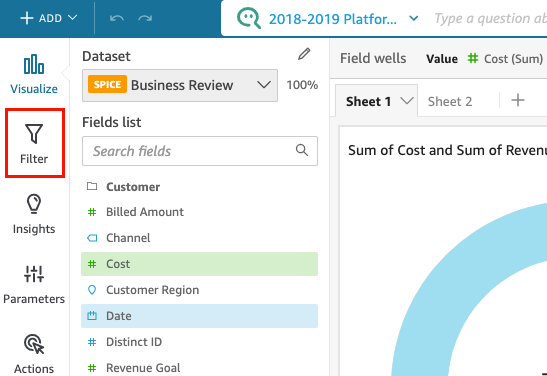You can use the filter menu to enable or disable a filter in a dataset or an analysis. When you create a filter, it's enabled by default. Disabling a filter removes the filter from the field, but it doesn't delete the filter from the dataset or analysis. Disabled filters are grayed out in the filters pane. If you want to re-apply the filter to the field, you can simply enable it.