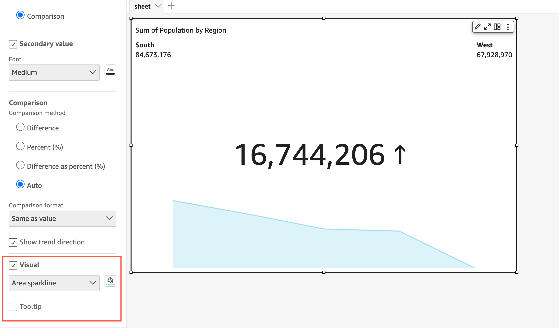 (Optional) Open the Visual dropdown and choose the type of visual that you want to display on your KPI. You can choose to display an area sparkline, a sparkline, or a progress bar. To display a sparkline, make sure that your KPI has a value in the Trend field well. Area sparkline is the default value.