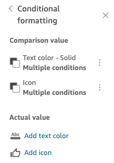 You can also add text colors and icons for the Actual value in thee Conditional formatting menu. To add a text color or icon to the actual value, choose Add text color or Add icon to set the new values. The following image shows the Conditional formatting menu of a KPI.