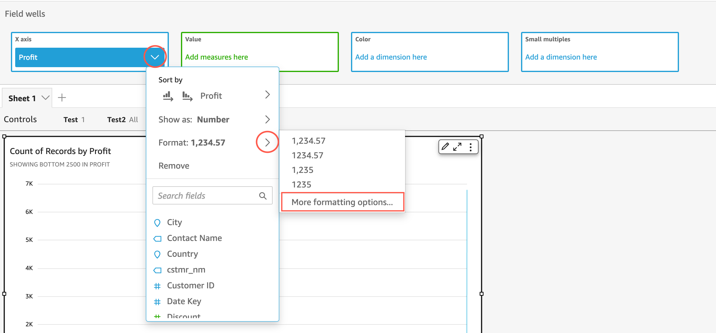 In the Field wells section of the analysis, open the dropdown next to the field that you want to change. Open the Format menu, and choose More formatting options.
