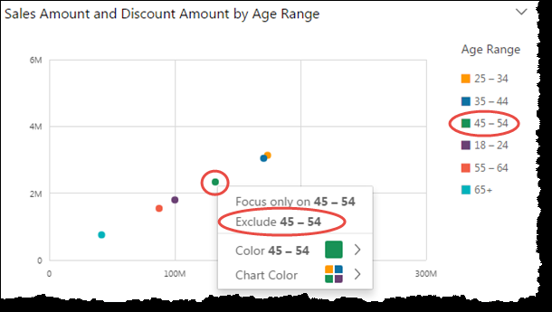 When viewing visuals, you can click an element on the visual, and then choose to remove the element. Elements to focus on can include, for example, a bar or bubble, or a row or column header in the case of a pivot table. You can exclude multiple elements from a single chart.