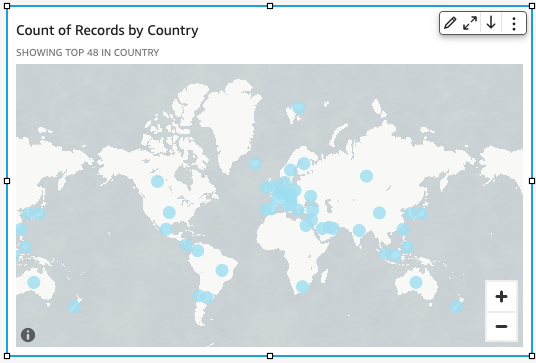 You can create point maps in Insights to show the difference between data values for each location by size. Each point on this type of map corresponds to a geographic location in your data, such as a country, state or province, or city. The size of the points on the map represents the magnitude of the field in the Size field well, in relation to other values in the same field. The color of the points represents the values in the Color field well. The field values in the Color field well display in the legend if you choose a field for color.