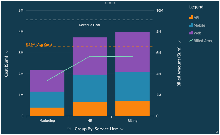 A calculated line displays at a position that's based on a value that is the result of a function. During configuration, you specify which measure (metric) you want to use and which aggregation to apply. These are the same aggregations you can apply to in the field wells. Then, you need to provide an aggregation to apply to the field calculation for the reference line, for example average, minimum, maximum, or percentile. The field needs to be in the dataset used by the chart, although it doesn't need to be displayed in the chart's field wells.