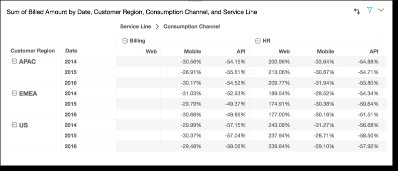 Applying the Percentage Difference function across the table rows, using Table across for Calculate as, gives you the following results.