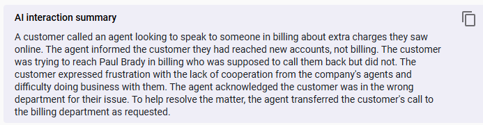 - (For audio contacts) An administrator has created an ongoing Analytics speech-to-text task with AI Interaction Summary enabled (see Turn on Interaction Summary or Create Analytics tasks).