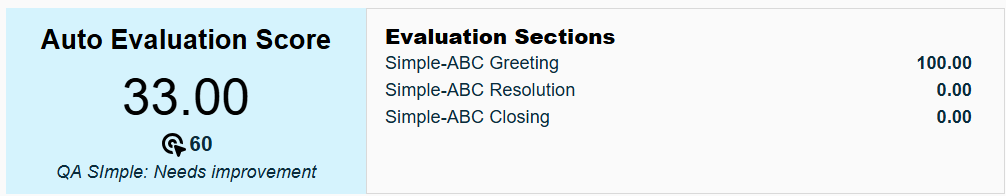 Click the AI conversation overview tab. The Auto Evaluation Score sections shows the overall score that Calabrio for RingCX gave to the contact. The Evaluation Sections section shows the score that Calabrio for RingCX gave to each section within the evaluation form that it used to score the contact. Depending on how the form was configured, you might also see the target score for the form and the name for the scoring band that the score falls into (see Manage forms for AI evaluation).