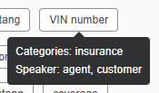 (Optional) Hover over a tag to see the category that the tag belongs to and the speaker (agent or customer) whose contribution to the conversation prompted Calabrio for RingCX to apply the tag.
