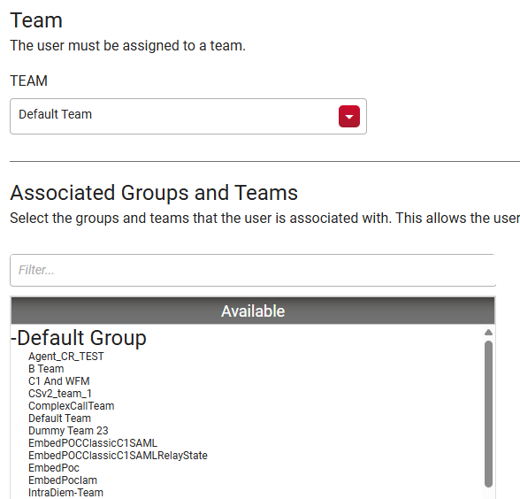 To see a user's scope, go to Application Management > Global > User Configuration > Users and select the user. The KPI Data Visibility setting applies to people whose user profiles look like the image below, with a team selected from the Team drop-down list but no groups or teams selected in the Associated Groups and Teams field.